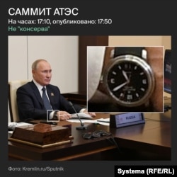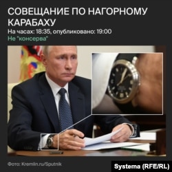 Тем же днем в том же кабинете Путин провел еще два мероприятия по видеосвязи – саммит АТЭС и совещание по ситуации в Нагорном Карабахе. На них часы Путина показывают правильное время, совпадающее с метаданными съемки.