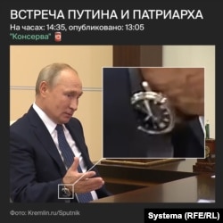 Вторая нестыковка. Наручные часы Путина во время встречи с Патриархом идут с сильным опережением. На них – 14:35. Рассмотреть часы можно на видео со встречи, которое опубликовано на ютуб-канале патриархии. Хотя это и непросто: почти всю встречу Путин держит правую руку под столом.